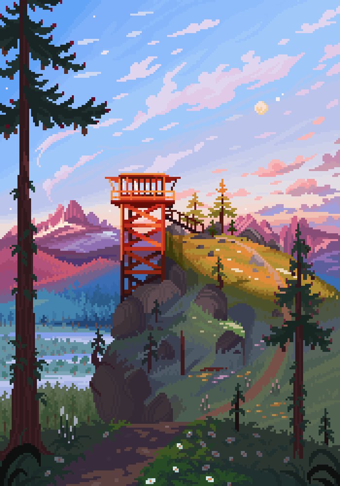 My favourite pixel artist, Jubilee, stays in firewatch towers in the Pacific Northwest every summer and shares pictures and makes art based on her time in the woods . I find her artworks particularly inspirational for this project- while not part of any particular game, the pixelated landscapes are right at home in the ecogame genre. She makes digital art inspired by the natural world she observes during her trips, recording the landscape that the tower exists to protect. I loosely based the shape of my tower on her work, and lightly furnished the interior with a bed, a stove, a tea kettle, and a fire extinguisher. Both versions of the tower, whole and burnt, are intended to be a tragic discovery. There is no forest to watch, and the burnt version suggests one possible explanation for where it went.