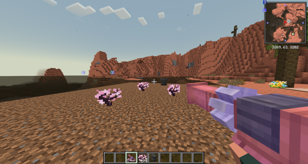 I try to put myself in the shoes of my younger self working briefly as a tree-planter (my friends would spend whole summers but I couldn’t stand the black flies) methodically digging holes and adding a sapling in rapid mindless pace, but the effect seems industrial and boring – who would want to roleplay being be a tree planter of this sort?  More rewarding is the Supplementaries mod cannon that can shoot saplings in high arcs that plant when they hit the ground, but I discover this is also slow going. I am eager to test our hacked Create mod potato cannon that will rapid fire saplings (and can be dual-wielded) as well as flying on my Enchanted: Witchcraft broom to sky bomb saplings from above.