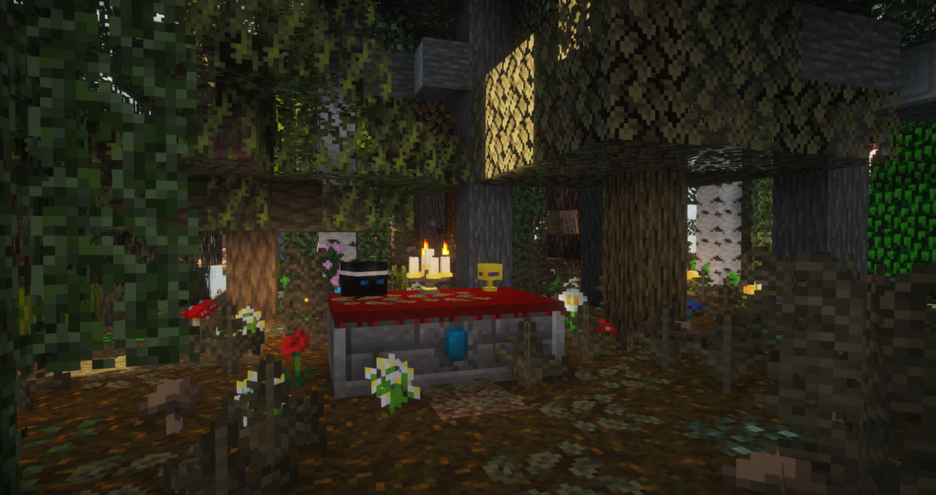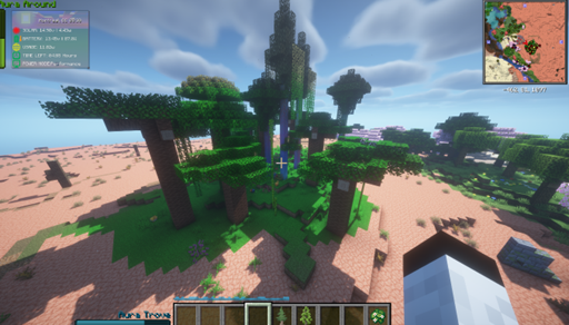 In our game the world starts with no distinct biomes and no trees (sort of… no spoilers). The players must work to generate these biome by biome, sapling by sapling.  An entire quest line involves a painstaking methodological process of crafting vanilla saplings, through tiers of modded saplings until you perform the ritual to produce a Ghaf tree sapling (the mythical “tree of life”) which will unlock the ability to renew the world’s biomes, generate new flora and fauna, and end the game (almost…  I am avoiding more spoilers here).  Because of this each sapling becomes special in its own way as quest goals, end game requirements and overall aesthetics and worldbuilding.  Players need to be concerned with where the trees come from (how they will be obtained), how they will grow (as bonemeal is disabled), and how they might interact with other trees and flora in players’ efforts to the create the forests which define the end of the game.